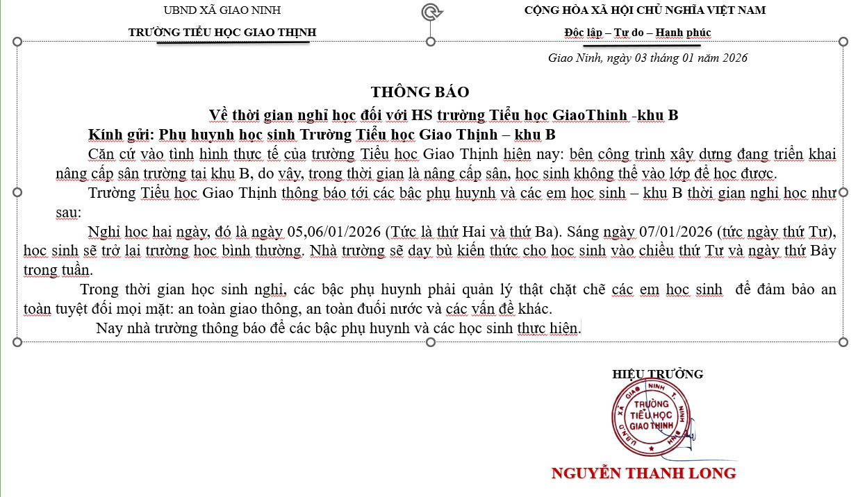 TRƯỜNG TIỂU HỌC GIAO THỊNH – THÔNG BÁO NGHỈ HỌC 2 NGÀY (05/01/2026, 06/01/2026) _KHU B